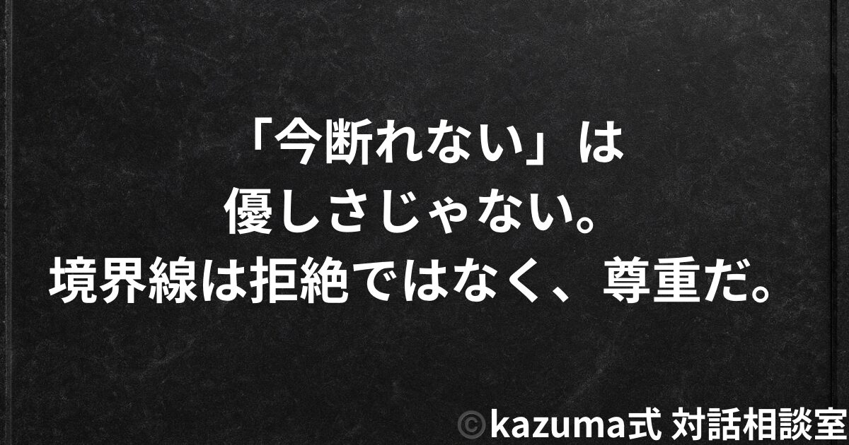 「断れない”優しさ”は、相手のためにも自分のためにもならない。境界線は”拒絶”ではなく”尊重”だ。」NOを言うことは、関係を長持ちさせるメンテナンスだ。