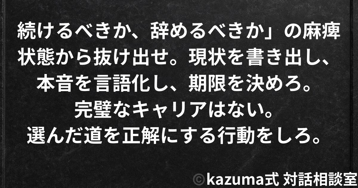 「続けるべきか、辞めるべきか」の麻痺状態は、情報過多と恐怖から生まれる。完璧な答えを求めるな。現状を書き出せ。本音を言語化しろ。小さく動け。キャリアに正解はない。選んだ道を正解にする行動をしろ。