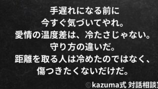 恋愛・人間関係愛情の温度差|なぜ”想われる側”は、いつも距離を取ろうとするのか 愛情の温度差は、冷たさじゃない。守り方の違いだ。距離を取る人は冷めたのではなく、傷つきたくないだけだ。温度差は関係の終わりではなく、成熟のサインだ。焦るな。君の温度を知れ。 2025.10.09恋愛・人間関係