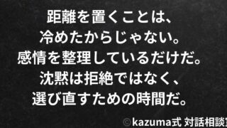 恋愛・人間関係沈黙は拒絶じゃない|”何も言わない人”が伝えようとしていること 沈黙は拒絶じゃない。言葉より正直な”信号”がある。焦るな。静けさの中にこそ、答えはある。|Kazuma式 2025.10.09恋愛・人間関係