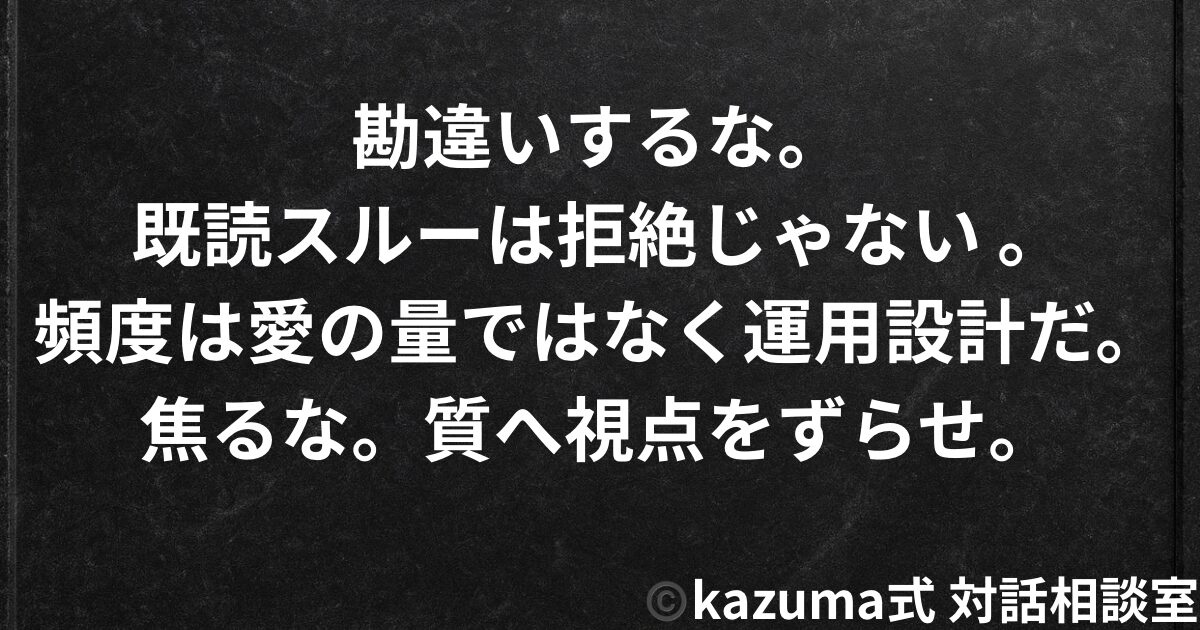 連絡頻度は、愛の量じゃない。既読スルーは拒絶じゃない。頻度は運用設計の話だ。焦るな。質へ視点をずらせ。追うほど、相手は離れる。