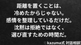 もし、君が「連絡が減った」「既読スルーされた」と不安を感じているなら、Kazuma式が扱う4大属性(恋愛・人間関係・孤独・自己肯定感)の中でも、特に恋愛孤独の領域を深く掘り下げる必要がある。Kazuma式 全方位型対話相談室 総合ページで、君の悩みに合わせた記事を探してほしい。
