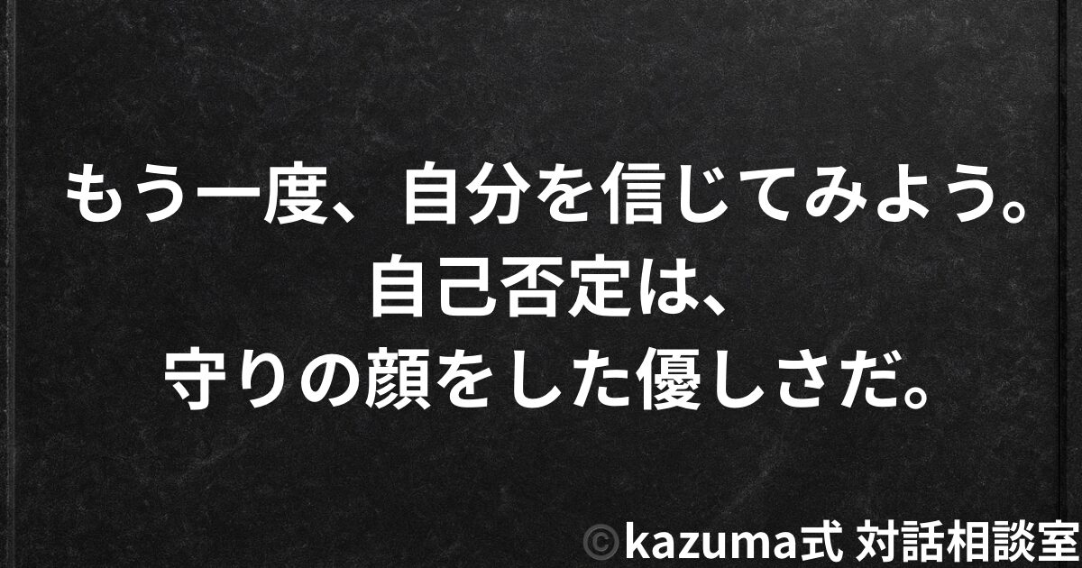 もし、君が「自分を信じられない」と感じているなら、Kazuma式が扱う4大属性(恋愛・人間関係・孤独・自己肯定感)の中でも、特に自己肯定感と孤独の領域を深く掘り下げる必要がある。Kazuma式 対話相談室 総合ページで、君の悩みに合わせた記事を探してほしい。