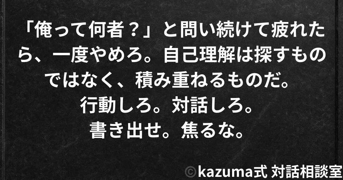 自己理解は一度で完結しない。対話の繰り返しだ。「俺って何者?」という問いに疲れたら、問うことを一度やめろ。行動しろ。感じろ。書き出せ。自己理解は探すものではなく、積み重ねるものだ。焦るな。
