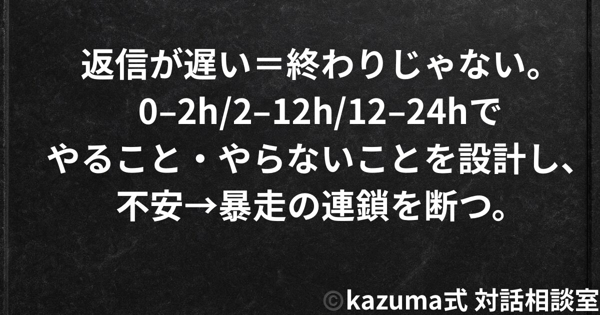 返信が遅い=終わりじゃない。不安→衝動→行動ミスの連鎖を、24時間の設計で断つ。0–2時間、2–12時間、12–24時間。やること・やらないことを明確にし、不安を拡大させるな。
