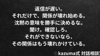 コミニケーション「返信が遅い」から生まれるすれ違い|沈黙の意味を勝手に決めるな 「返信が遅い」ことで不安になる。その沈黙を「拒絶のサイン」と勝手に解釈し、関係を壊す。すれ違いを防ぐには、相手に聞くこと。沈黙の意味を勝手に決めるな。 2025.10.02コミニケーション人間関係の溝恋愛