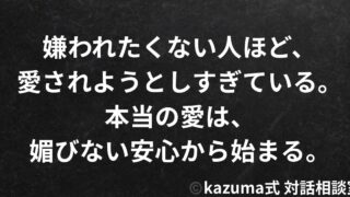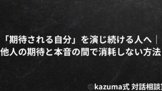 人間関係「期待される自分」を演じ続ける人へ|他人の期待と本音の間で消耗しない方法 「期待を手放す=自分を信じるという選択」だ。期待を満たすことは、存在の取引ではない。本音を出せないのは、自分を信じていないからだ。期待される自分を演じるのをやめ、本当の自分を生きろ。|Kazuma式 2025.10.16人間関係