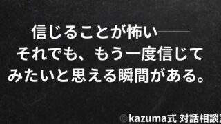 人間関係「信じることが怖い」──それでも人を信じてみようと思える瞬間がある。|信頼回復と再接続の心理 信じることが怖いなら、それでいい。怖くても、もう一度誰かを信じたいと思えた時、君はすでに”信じている”側にいる。信じる勇気は、愛よりも強い。許さなくても、信じることはできる。|Kazuma式 2025.10.12人間関係