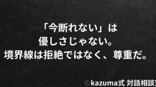 人間関係「断れない」は優しさじゃない。|バウンダリー(境界線)の引き方5ステップ 「断れない”優しさ”は、相手のためにも自分のためにもならない。境界線は”拒絶”ではなく”尊重”だ。」NOを言うことは、関係を長持ちさせるメンテナンスだ。丁寧なNOのテンプレートと静かな習慣で、境界線を保て。|Kazuma式 2025.10.14人間関係
