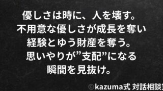 人間関係優しさで人を壊す人|”思いやり”の裏にある支配 優しさは時に、人を壊す。思いやりが”支配”になる瞬間を見抜け。相手の「No」を受け入れろ。沈黙も距離も、優しさの形だ。|Kazuma式 2025.10.10人間関係