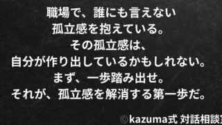コミニケーション職場で孤立感を感じる理由|誰にも言えない疎外感の正体 職場で孤立感を感じる原因は、コミュニケーション不足、価値観の違い、派閥、自己開示の不足、無自覚な距離の取り方。自分から話しかけ、輪に入る努力をすることで、孤立感は解消できる。 2025.10.02コミニケーション人間関係の溝職場の人間関係