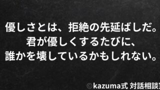 人間関係優しさで人を壊す人|なぜ”優しさ”は時に、相手を傷つけるのか 優しさで人を壊していないか。優しさの裏には、罪悪感の回避、依存、拒絶の先延ばしが隠れている。本当の愛は、相手の痛みに踏み込む誠実さだ。優しさではなく、誠実さを選べ。 2025.10.08人間関係