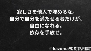 依存体質克服寂しさを人に依存せず癒す方法|自分で自分を満たす5つの力 寂しさを人に依存して癒すと、依存体質になり、相手を失えば崩れる。必要なのは、自分で自分を満たす力。自己充足、自己対話、創造的な活動、身体を整える習慣。自分で満たせる者だけが、真に自由になれる。 2025.10.02依存体質克服孤独感自立