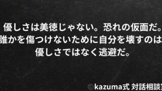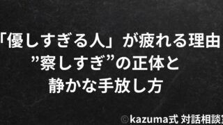人間関係「優しすぎる人」が疲れる理由|”察しすぎ”の正体と静かな手放し方 「“気づける人”ほど、心が摩耗している。」察しすぎることは、境界線が壊れているサインだ。優しさと依存の境界を理解し、手放す優しさ=静かな信頼を持て。見守る勇気が、最上の優しさだ。|Kazuma式 2025.10.14人間関係