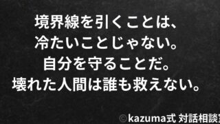 人間関係「断れない」は優しさじゃない。|バウンダリー(境界線)の引き方5ステップ 「断れない”優しさ”は、相手のためにも自分のためにもならない。境界線は”拒絶”ではなく”尊重”だ。」NOを言うことは、関係を長持ちさせるメンテナンスだ。丁寧なNOのテンプレートと静かな習慣で、境界線を保て。|Kazuma式 2025.10.14人間関係
