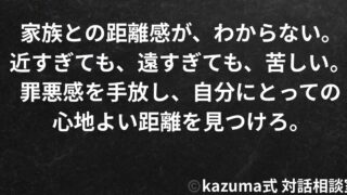 人間関係の溝家族との距離感に悩む時の整理法|近すぎても遠すぎても苦しい関係 家族との距離感に悩むのは、期待と現実のズレ、価値観の違い、過去の傷、干渉と放置のバランス、「家族だから」という思い込みが原因。罪悪感を手放し、心地よい距離を見つけろ。 2025.10.02人間関係の溝家族関係距離感