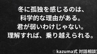 メンタルヘルス冬に孤独感が強くなる理由|季節が心を支配するメカニズム 冬に孤独感が強くなるのは、日照時間の減少、気温の低下、社会的イベントの多さが原因。科学的に証明された現象であり、君が弱いわけではない。対処法を知れば、乗り越えられる。 2025.10.02メンタルヘルス季節と心理孤独感