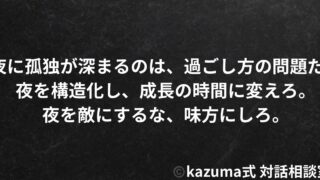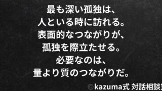 孤独「一人が楽」って言うけど、本当は”誰にも踏み込まれたくないだけ”だ。|孤独と回避型の心理 一人が楽って言うけど、本当は誰にも踏み込まれたくないだけだ。孤独を選ぶより、静けさを選べ。守るより、信じてみろ。矛盾を認めることが、回復の始まりだ。|Kazuma式 2025.10.12孤独