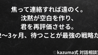 人間関係「連絡しない方がいい」期間の真実|沈黙が復縁を近づける理由 「連絡しない方がいい期間」は存在する。別れた直後から2〜3ヶ月。沈黙が相手の心に空白を作り、君の存在を再評価させる。焦って連絡すれば遠のく。沈黙こそが、最強の戦略だ。 2025.10.02人間関係復縁判断恋愛来客期間戦略