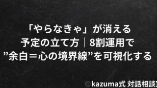 人間関係「やらなきゃ」が消える予定の立て方|8割運用で”余白=心の境界線”を可視化する 「時間がない」とは、他者と自分の境界線が曖昧だからだ。予定を100%埋めるな。8割運用で余白を作れ。余白は逃避ではない、“心の可動域”だ。休む勇気は、自分への信頼の証だ。|Kazuma式 2025.10.14人間関係