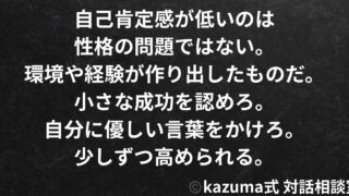 自己肯定感自己肯定感が低い人の5つの特徴|自分を認められない理由と高める方法 自己肯定感が低いのは性格ではなく環境や経験が作ったもの。他人と比較し、褒められても受け取れず、失敗を恐れる。小さな成功を認め、自分に優しい言葉をかけ、少しずつ高める方法を解説。 2025.10.05自己肯定感