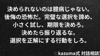 生き方・自己理解人生の選択に迷ったら|決められない時の対処法と納得できる選択の見つけ方 決められないのは臆病ではなく後悔の恐怖だ。完璧な選択を諦め、小さく試し、期限を決め、直感を信じろ。選択は選んだ後の行動で決まる。納得できる選択を見つける方法を解説。 2025.10.03生き方・自己理解